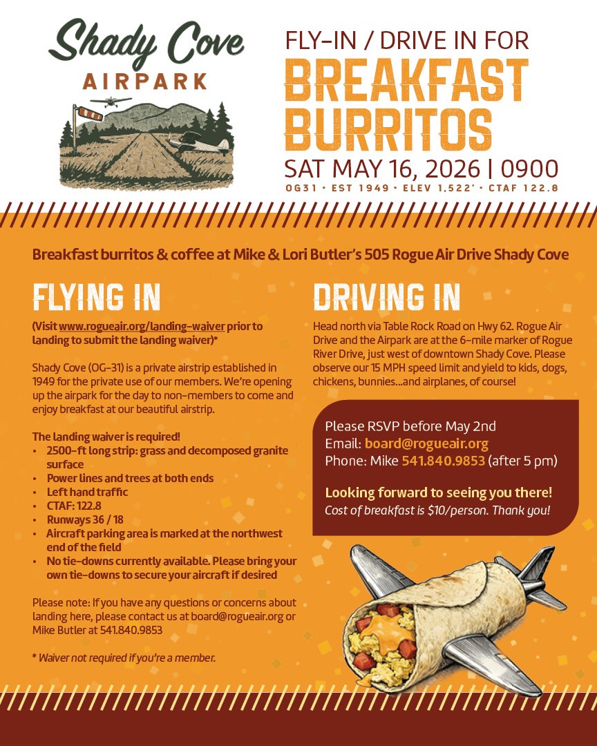 What’s happening in our little slice of aviation heaven? This spring it’s flying, friends, and Breakfast Burritos! May 16th, 2026 Shady Cove, Oregon